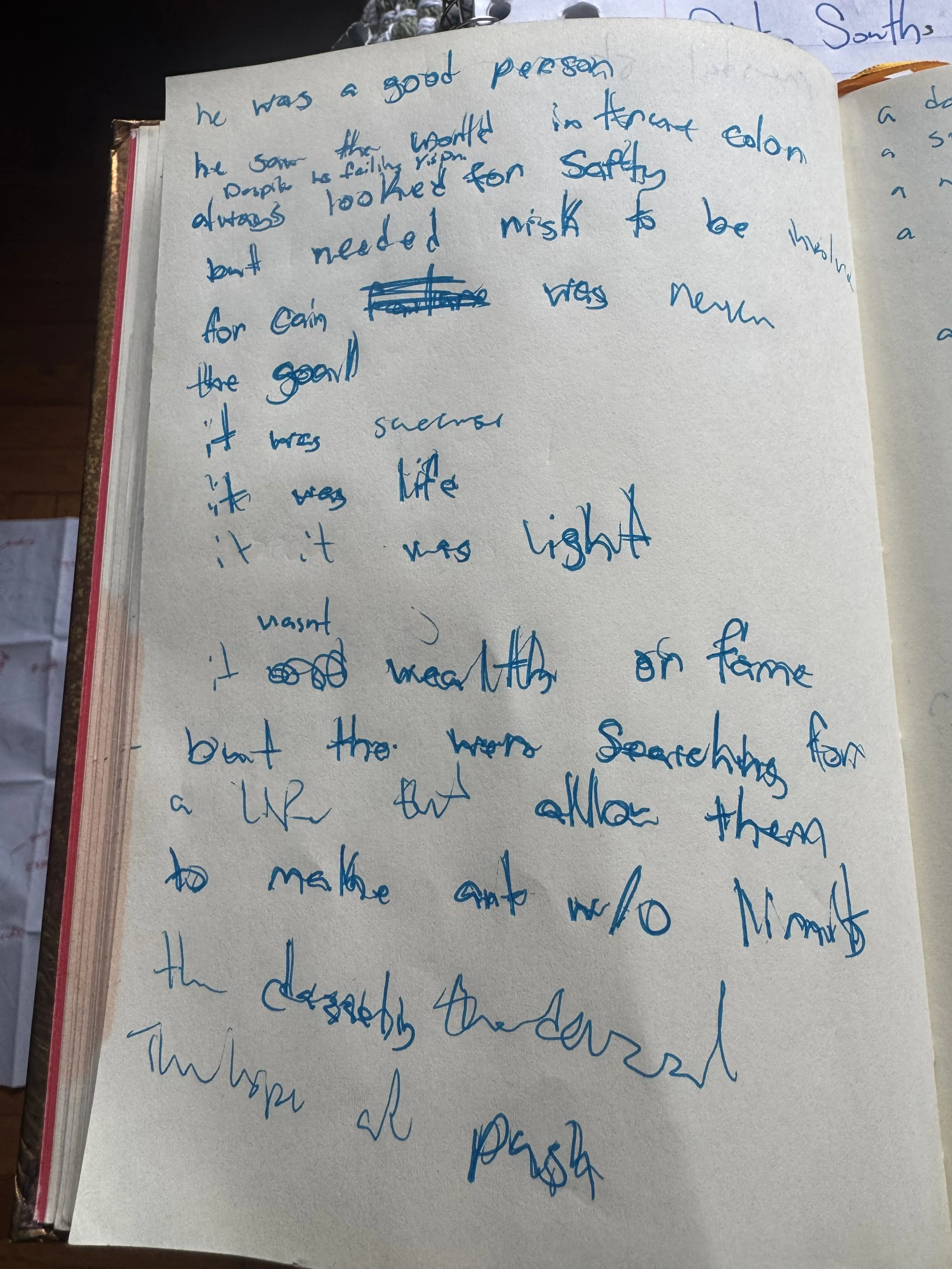 This semester concluded with the first public showing of my developing work, Death and Life of an Entertainer, presented in my World-Making class. Experiencing the piece live—both in my body and later through its physical archive of recordings, sound, and documentation—has reshaped my understanding of the work and deepened my awareness of its potential. The performance revealed a new physical, emotional, and energetic threshold for me. I felt myself confronting a different way of existing in space with this material, inviting a more vulnerable, present, and embodied encounter between myself, the work, and the audience.